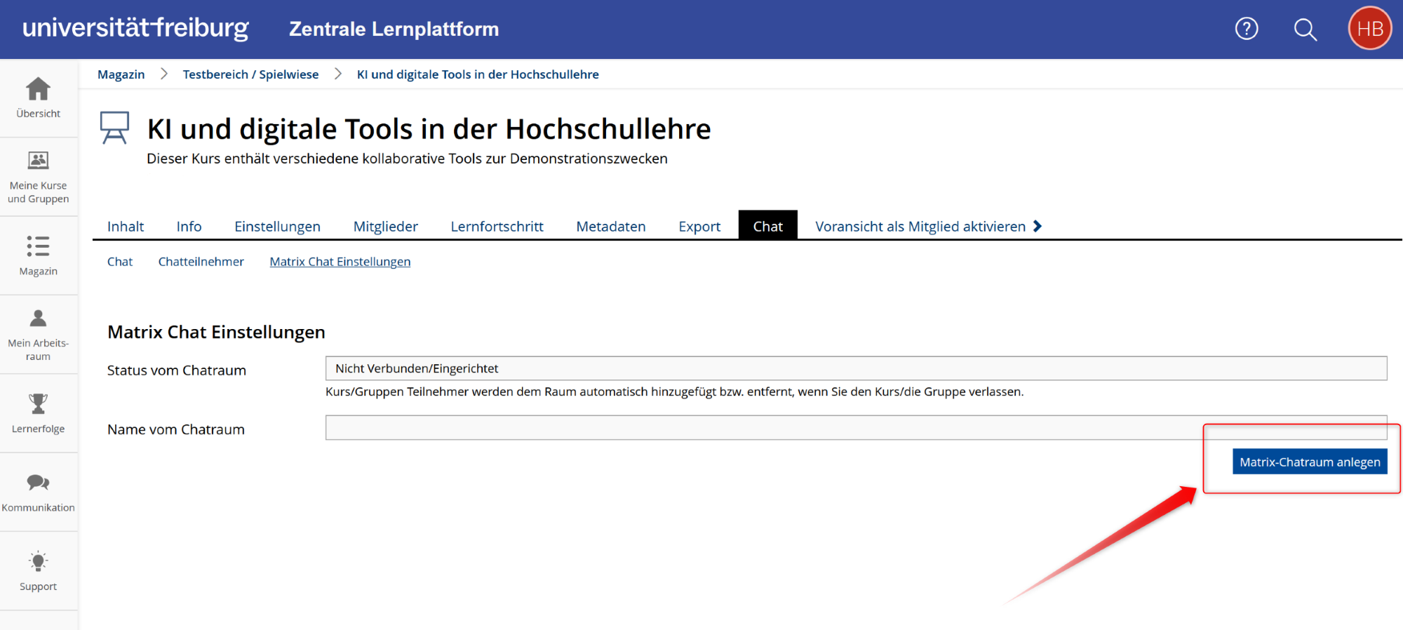 1. Um einen Matrix-Raum für Ihren Kurs zu aktivieren, klicken Sie im Kursraum auf den Tab „Chat“.
