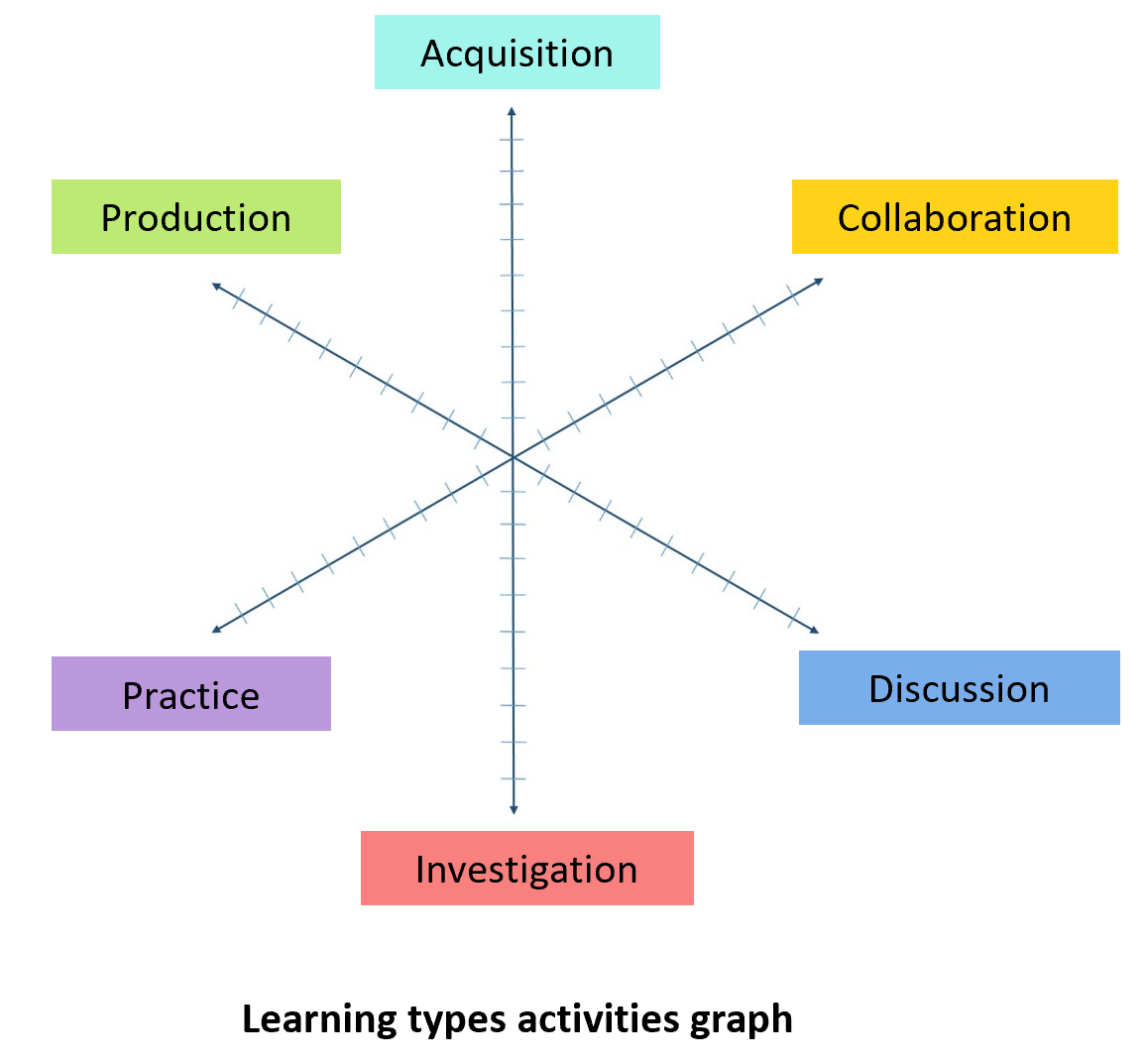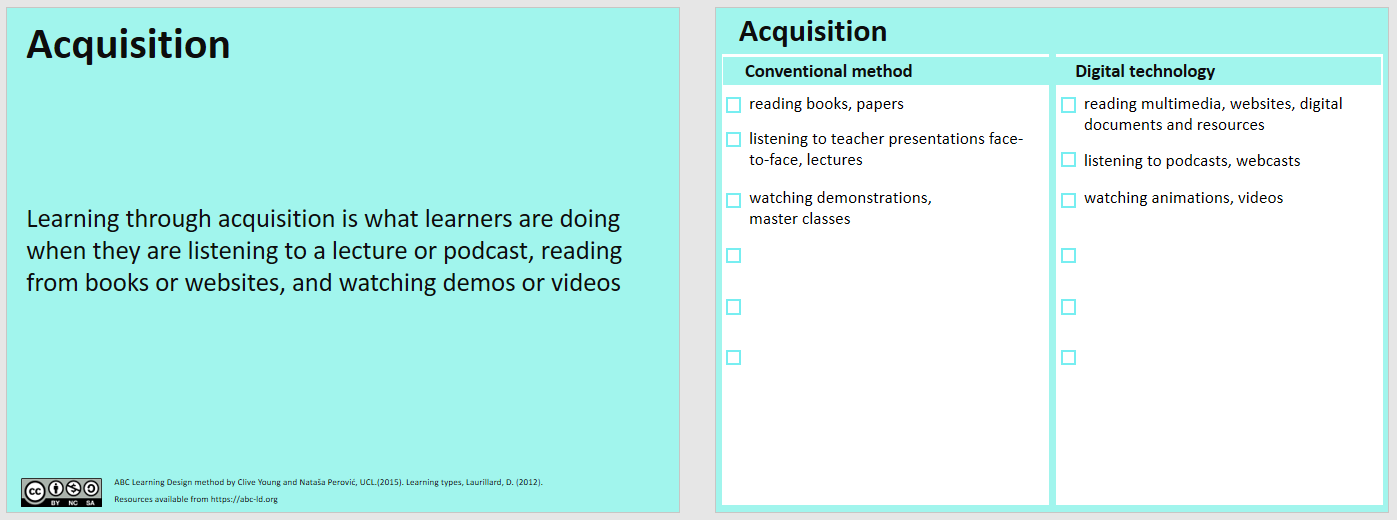 Grafik entnommen aus: "ABC Learning Design method" by Clive Young and Nataša Perović, UCL. (2015). Learning types, Laurillard, D. (2012). Licensiert under CC BY NC SA 4.0 International. Download unter abc-ld.org.