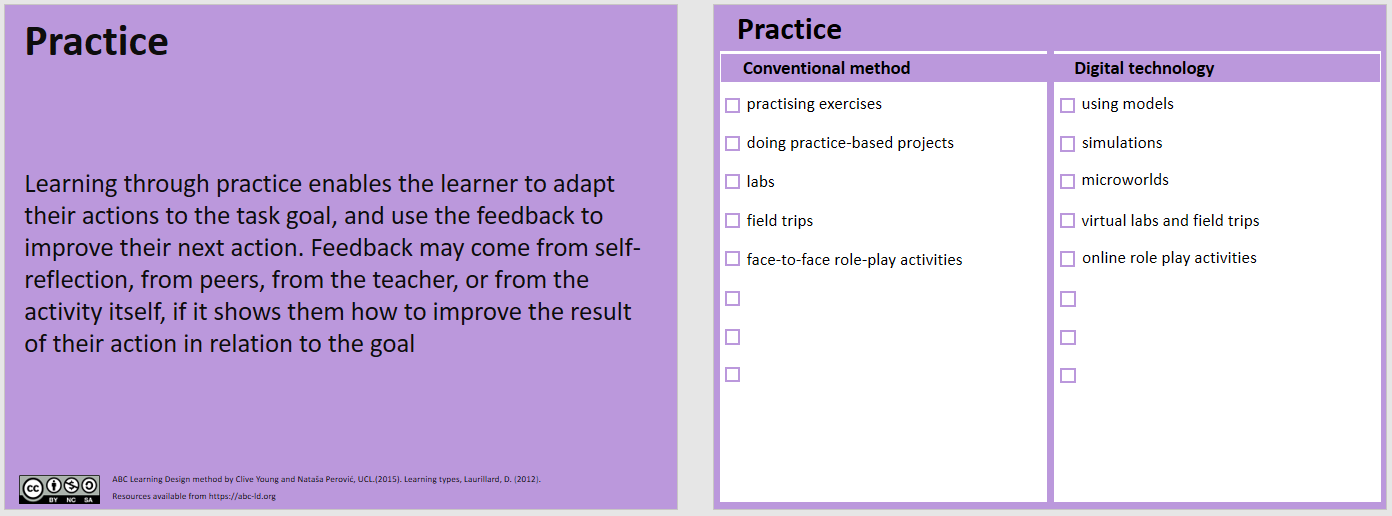 Basierend auf der Lehr-Lerntheorie von Prof. Diana Laurillard wurde die ABC-Learning-Design-Methode ursprünglich von N. Perovic und C. Young am UCL (University College London) im Jahr 2015 entwickelt. Der Ansatz und die Materialien, die unter einer Creative-Commons-Lizenz stehen, werden mittlerweile von einer zunehmenden Anzahl von lehrunterstützenden Einheiten an Hochschulen verwendet, insbesondere da sie leicht an institutionelle Besonderheiten angepasst werden können.
