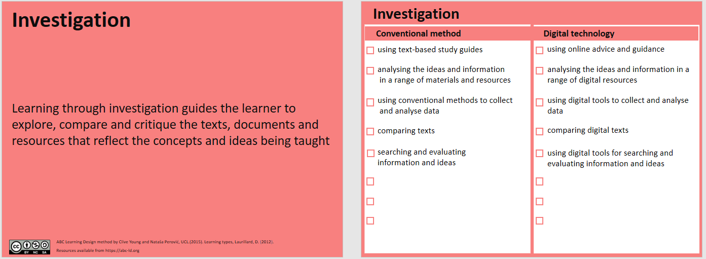 Zur Erleichterung der Gestaltung jeder Art von (digital erweitertem) Lern- und Lehrszenario hat sich der ABC Learning Design -Rahmen als unschätzbares visuelles Planungswerkzeug erwiesen.