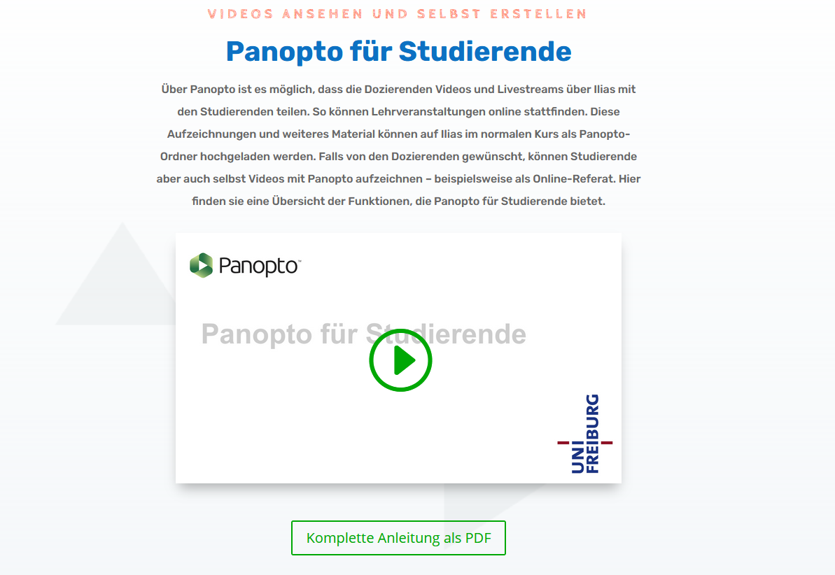 Eine Übersicht der Funktionen, die Panopto für Studierende bietet und weitere Informationen findest du hier: https://www.panoptosupport.uni-freiburg.de/fuer-studierende/